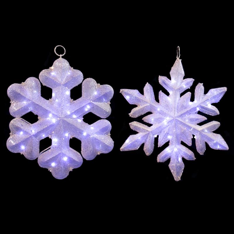 | These 18-inch lighted white-glitter snowflakes come in an assortment. The assortment features two of each snowflake - both are 18" with 40 LED cool white lights. Each snowflake has 6 outer points, but one includes an additional interior 6-point snowflake that can be used indoors/outdoors and has an IP44 plug. |