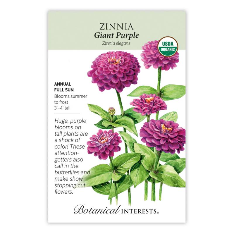 | With long, sturdy stems, these bright, 4"–6" flowers are great for colorful, long-lasting bouquets. Zinnias are a customer favorite and so easy to grow from seed. Once they begin to bloom, they bloom and bloom endlessly until frost! 'Giant Purple' is heat tolerant and disease resistant. Zinnias are edible, but have little flavor. The colorful flowers can make a pretty garnish to salads, desserts, cold drinks, or serving trays. (The flower's central disk, while edible, can be bitter.) |