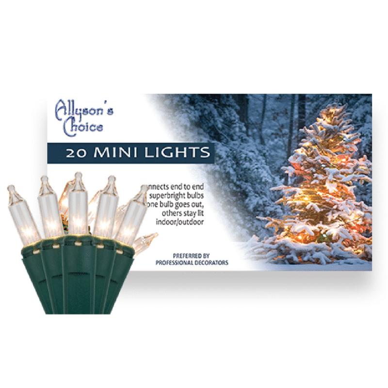 | All Alyson Choice light sets are UL-approved. This set comes with 20 clear incandescent lights with a 1200- 1500-hour bulb life and 3.5-inch bulb spacing. The total length is 6.25 feet, and the green cord has an end-to-end connector. The lead length is 6 inches on either end. For indoor use only |