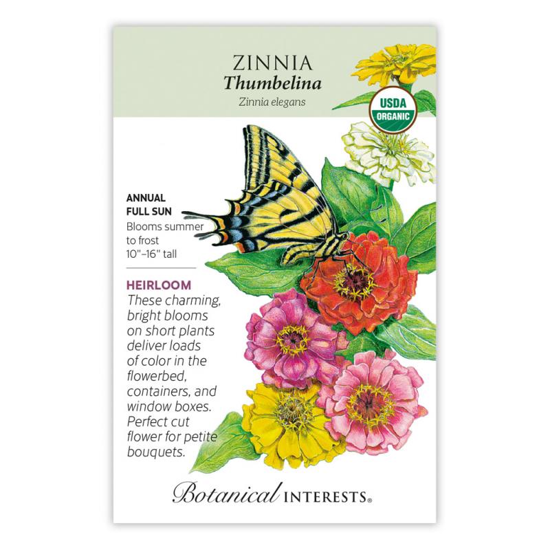 | Thumbelina is destined to be the darling of your garden! A 1963 All-America Selections winner, this charming variety may be shorter, but still produces an abundance of cheerful blossoms in a wide range of colors. Zinnias are edible, but have little flavor. The colorful flowers can make a pretty garnish to salads, desserts, cold drinks, or serving trays. (The flower's central disk, while edible, can be bitter.) Zinnias thrive in heat, bloom all season, and are very easy to grow. Each individual flower lasts a very long time on the plant or in a vase. |