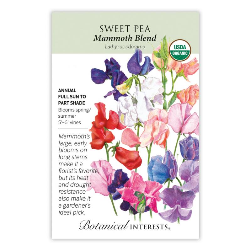 | Aptly named, Mammoth sweet peas have extra-large flowers with lengthy stems—perfect for cutting! The subtle, sweet scent is delightful, too. Developed in the 1980s from Early Multiflora Gigantea, a Spencer-type sweet pea, this variety boasts drought and heat resistance, which results in a longer season of blooms. Attracts pollinators. Deer resistant. Caution: Most parts of this plant are toxic if ingested. |