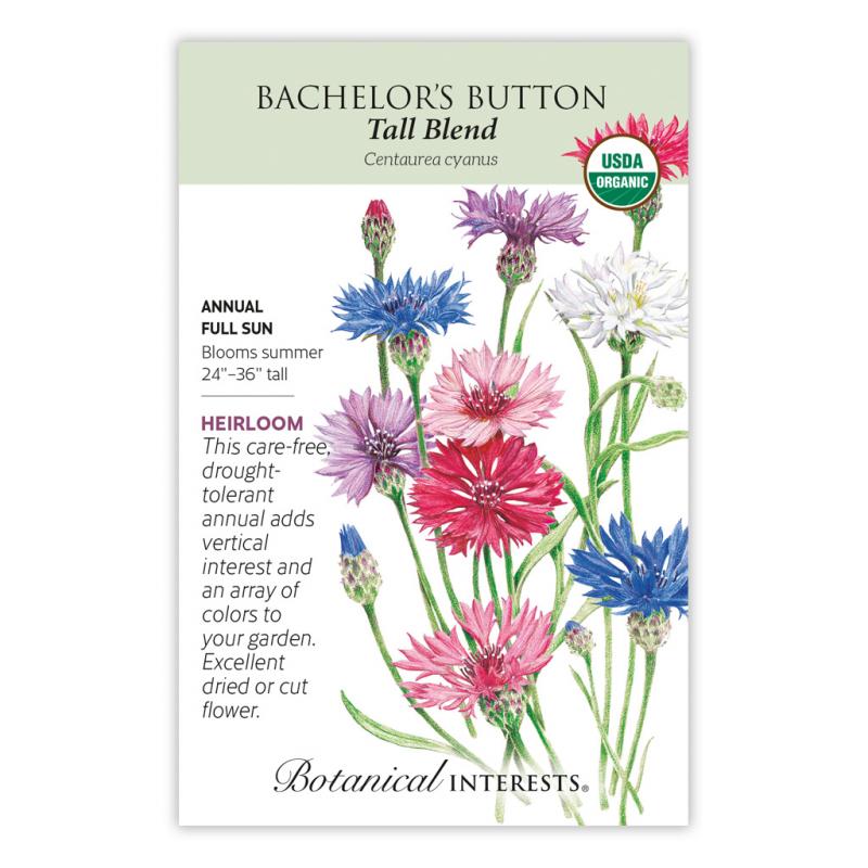 | Bachelor's button, also known as "cornflower", is drought tolerant and needs little pampering. Flowers are great for cutting or drying and the edible petals are beautiful sprinkled on a salad. Bachelor's button will "naturalize"; it self-sows for another crop of flowers the following season, and birds love the seed heads! Attracts pollinators and beneficial insects. |