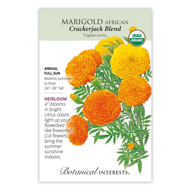 | If you want a large, majestic marigold, Crackerjack is a superior blend with a mounding form, consistent height, and sturdy flower stalks. The 4" blooms in tangerine orange, rich gold, and lemony yellow will brighten up your flower bed, path edges, and large container plantings. They make radiant, long-lasting cut flowers and are so easy to grow from seed. African Marigold petals are edible with a slightly bitter, citrusy/spice flavor. They make a pretty garnish on rice, salads, or desserts. For a dazzling contrast, plant next to blue or dark purple flowers. Be prepared for butterflies to visit! |