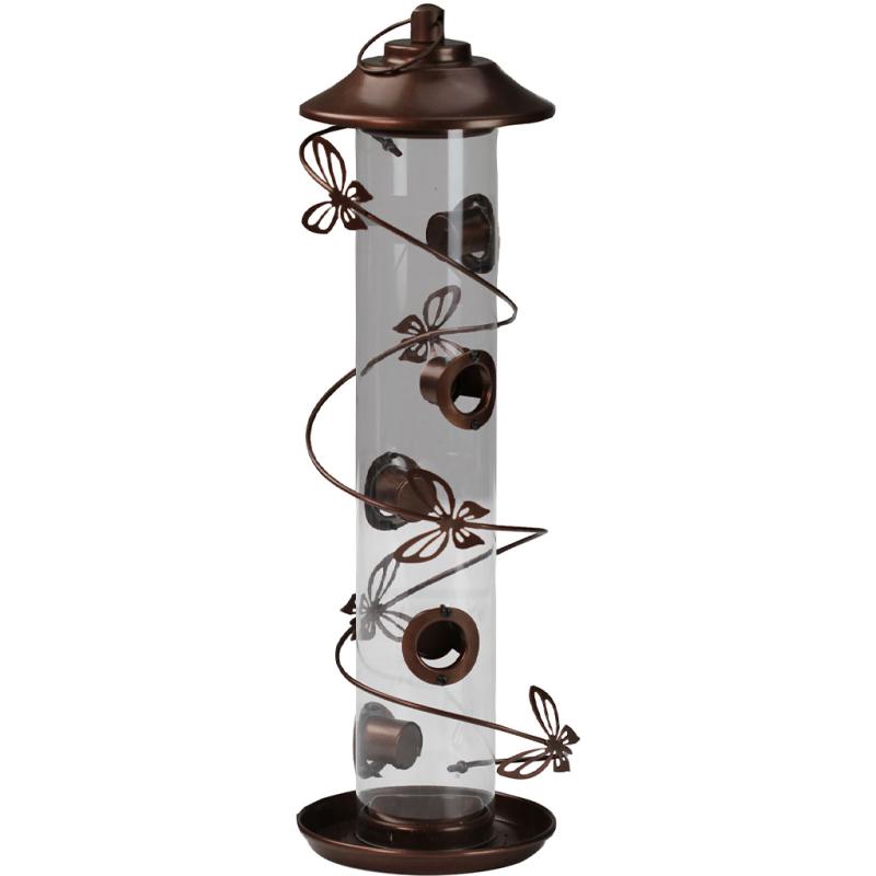 | Five feeding ports with steel and plastic construction. Butterfly wrap provides more areas for perching. Includes the capacity for up to one pound of mixed seed. Top unscrews to fill. |