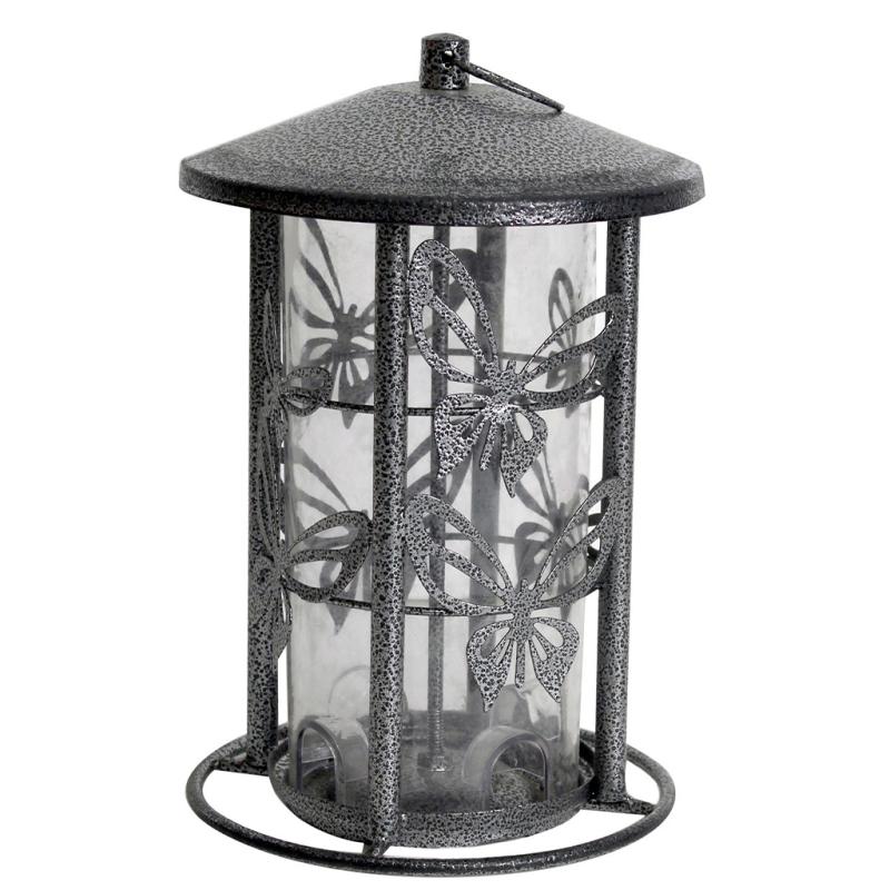 | The Butterfly Bird Feeder combines durability with delicacy. The heavy-duty steel and plastic construction will ensure its longevity for many seasons. It features a large 3-pound seed capacity and 4 feeding ports around the base. Delicate butterflies add character to the design. The top unscrews for refilling and cleaning. |