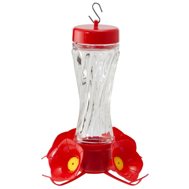 Description: The Audubon hummingbird feeder has a clear glass swirl bottle. Includes a decorative twist off base. No drip flowers with 4 swirling perches which makes it easy to fill and clean.