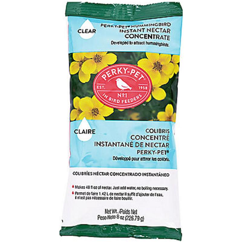 Description: The Perky-Pet Original Instant Nectar is made of 100% sucrose, which provides the highest amount of energy to hummingbirds. This hummingbird nectar concentrate is so easy to use- simply stir in water. No artificial color or sweeteners added. No boiling required. 8 oz. makes 48 oz.