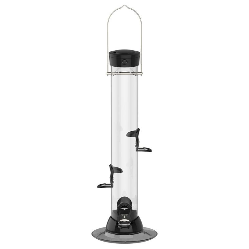 | The world’s cleanest feeders just got cleaner! Twist-and-release removable base technology makes cleaning a breeze and helps maintain the health of birds. The two-part port configuration permits unobstructed seed flow and gives the feeder an elevated level of design elegance. The wide comfort perch feature will attract a greater variety of birds. Spring-loaded flip top enables the feeder to be opened and closed with one hand. Tray included. |