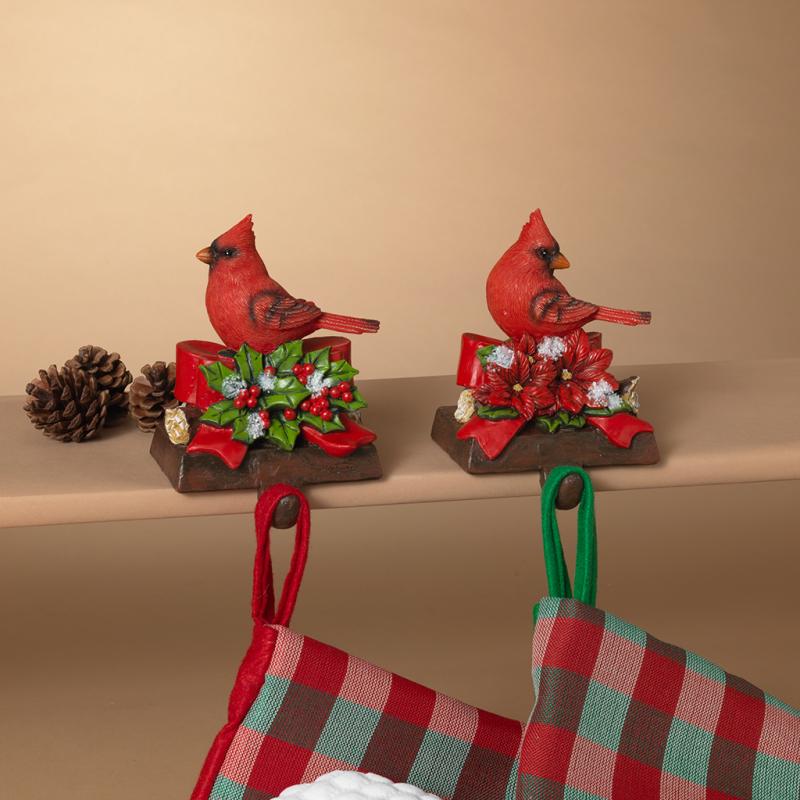| The Cardinal Stocking Holder adds a tremendous festive touch to the mantel. There are two styles of 5.5-inch resin holiday cardinal stocking holders: one has the cardinal facing to the left, and the other has its body facing to the left, but the cardinal's head is turned facing to the right. |