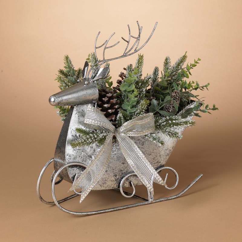 Gerson Silver Metal Deer Sleigh with Greens