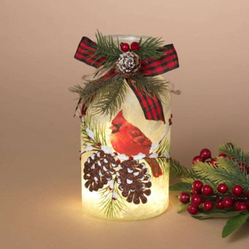 Description: 7.9" Tall - Battery Operated Lighted Holiday Cardinal Jar Luminary with Floral