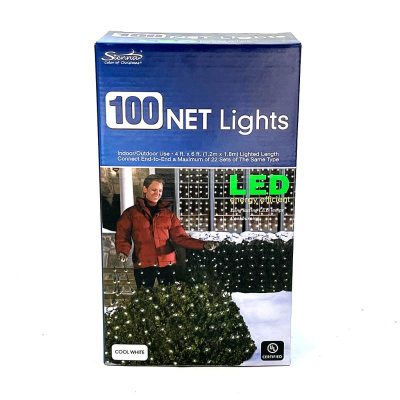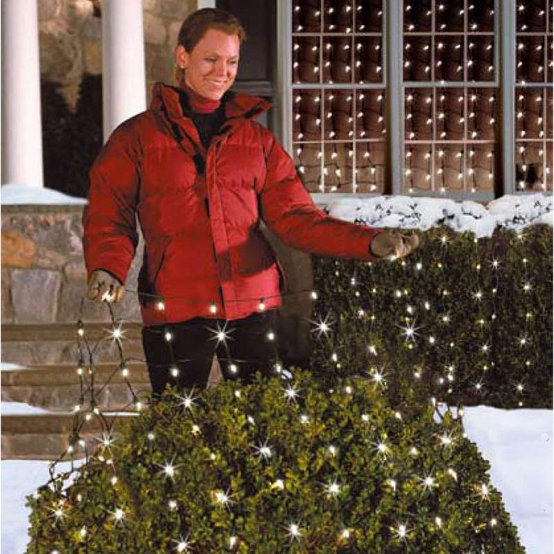 Description: Decorate trees, hedges, bushes, and more in just minutes! Twice the density in the same amount of space. Simple and easy to use. They can be connected end to end. The web-style netting has 100 LED warm white lights. The total lighted area is 24 square feet (4 feet by 6 feet). If one or more bulbs burn out, the rest stay lit.