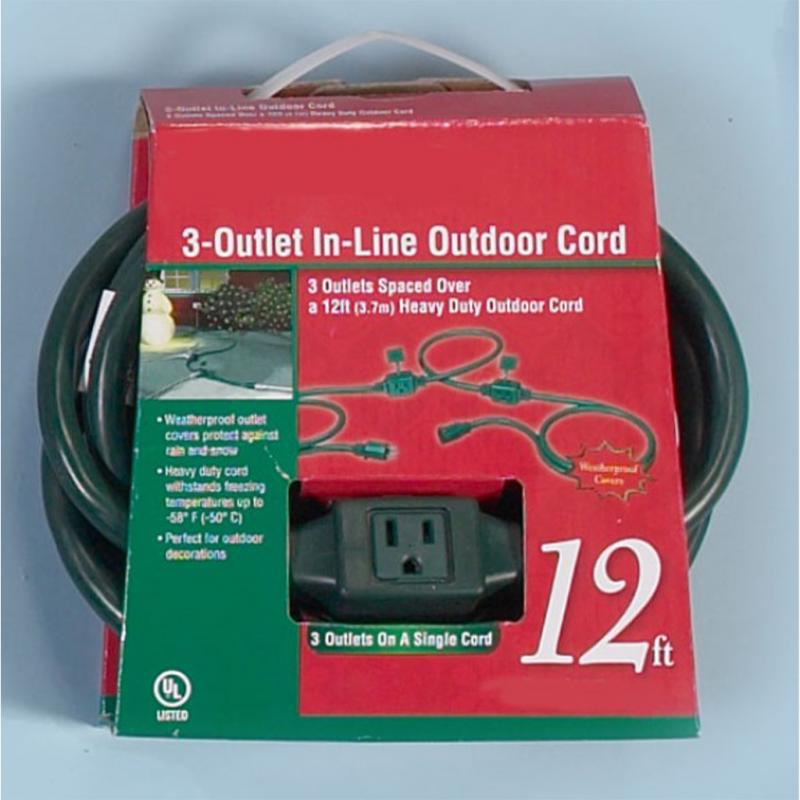 | This 12-foot green UL extension cord has three outlets spaced 3.5 feet apart. The cord is a 14/3 SJT wire with 13 amp, 125V, 1625W rated A heavThis-duty cord with outlet covers. Enou has enough to decorate the entire yard. It's grounded for use with three wirethreeplugs and outlets polarized security for proper alignment of hot and neutral wires. It has a double-insulated cord and one-piece molded plug construction for extra durability, which can be used outdoors. |