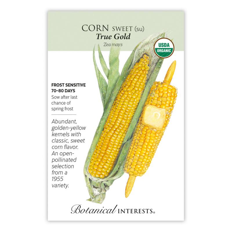 | Old-fashioned corn like your grandparents grew! From the garden to the pot, 'True Gold' will transform any plate to a luxurious meal. Large, 9" ears are very sweet and tender, plants are resistant to stalk-lodging, and stalks are less likely to bend and kink in windy areas. |
