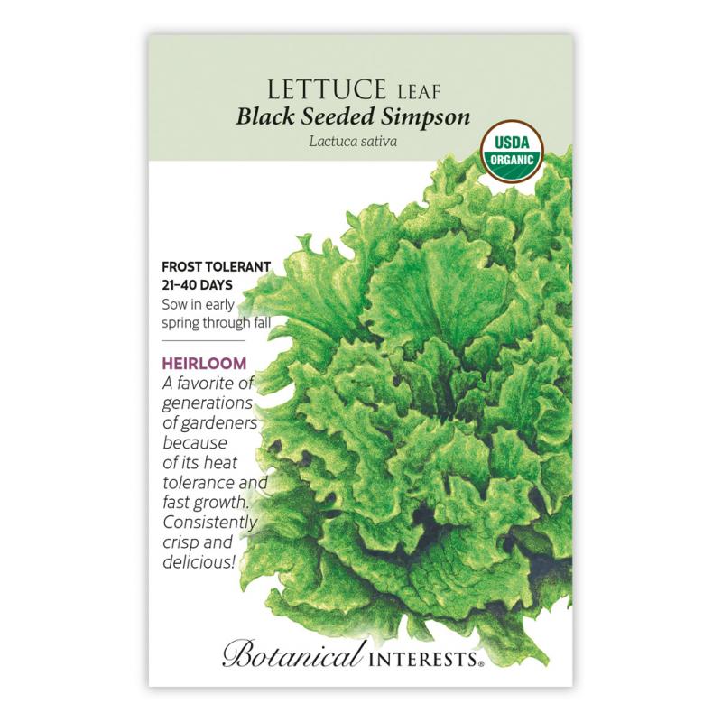 | Since 1850, 'Black Seeded Simpson' has been a garden favorite for quality, texture, and flavor. Full-sized, frilly leaves can be picked in just over a month, and baby greens can be harvested in 3 weeks! Withstands hot, dry conditions and light frosts better than other varieties. |