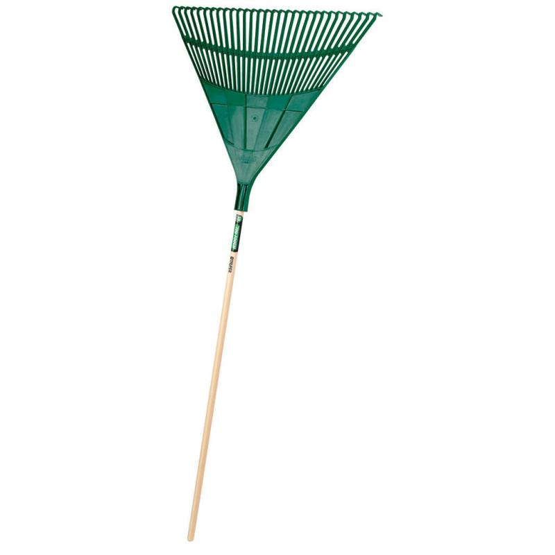 Home-owner grade poly leaf rake with 30" head and 48" wood handle. 10 year warranty.