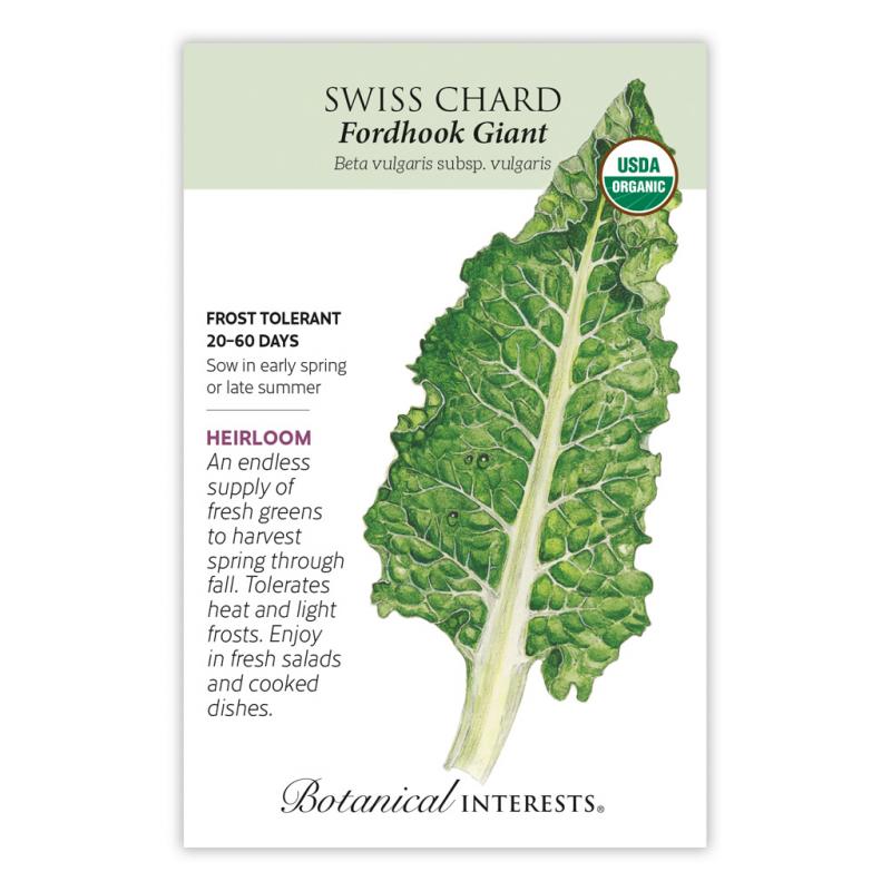 | Fordhook Giant' is an old favorite with its broad, strong stems and large leaves packed with vitamins and minerals. A vigorous grower with a long growing season, it will provide fresh greens from early summer into fall, and year-round in mild climates. White stem varieties are generally more bolt and cold tolerant and more productive than colored stem varieties. Young leaves are great for salads. Glows in containers as an ornamental. |