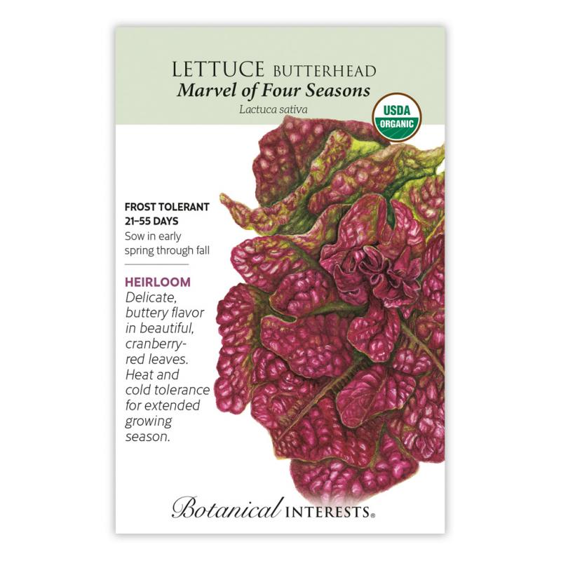 | Both tasty and attractive, this 1800s French heirloom also known as Merveille de Quatre Saisons has tender, sweet leaves that are green at the base, turning to a beautiful cranberry-red, and forming a crinkly rosette that almost looks like a flower! If kept moist, it won't turn bitter when heat arrives. Rosettes are 8"–12" in diameter, good for large containers. |