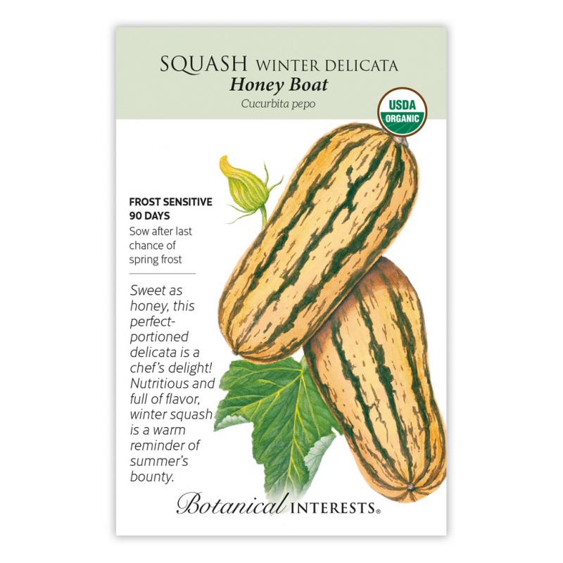 | A baked and buttered 'Honey Boat' with or without a sprinkling of cinnamon sugar makes a succulent treat for a chilly autumn day! The rich, golden-orange squash has a delectably sweet, nutty flavor. High in calcium, potassium, folate, and vitamins A and C. There's no better way to enjoy summer sunshine in the depths of winter. 9'-12' vines. |