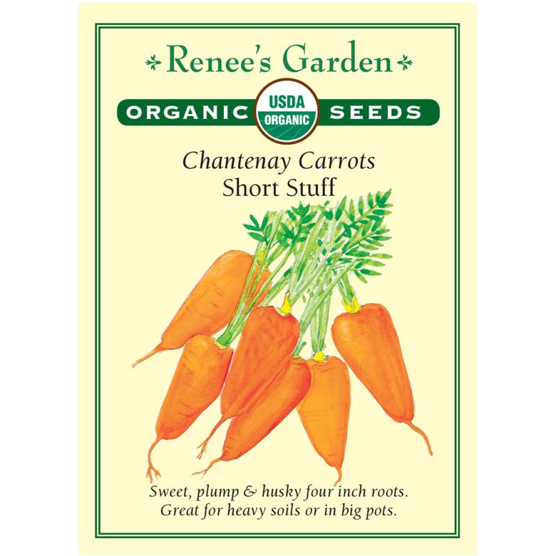 | Great-tasting, sweet, and crunchy Chantenay carrots with fat, husky, tapering triangular roots that grow just 4 inches long. These plump beauties are fine-fleshed, juicy & bright orange to the core. They are wonderful, fresh, eating carrots. Because of their shorter length and impressive vigor, Short Stuff carrots are well-suited for heavy soils. Also perfect for planting in container gardens; use pots at least 12-15 inches deep and feed and water regularly for sweet roots |