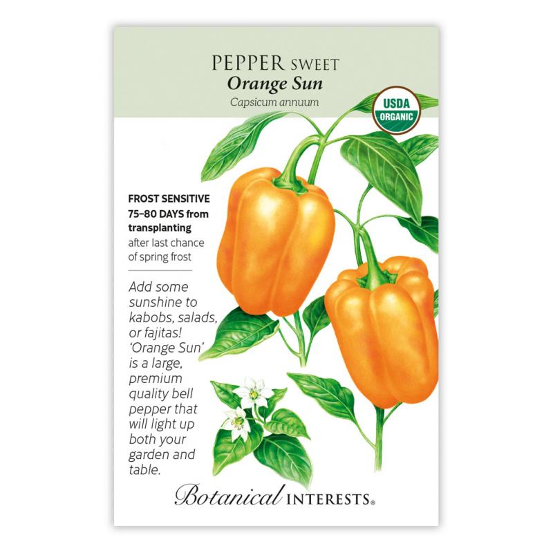 | Expect big things from this large, sunny pepper that boasts thick walls with rich, sweet flavor. 'Orange Sun' turns from green to orange, pick in both stages to boost production and give meals more color! This pepper is so pretty, you may want to put it in a container on the patio! |