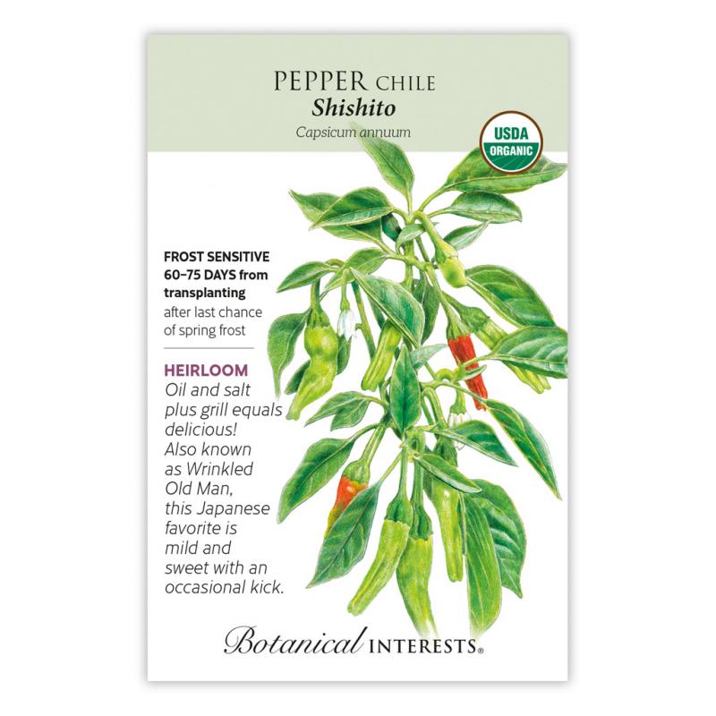 | The 'Shishito' is finding its way into many restaurants as a popular appetizer. The 2"–4" slender peppers have a citrusy, slightly smoky flavor enhanced by grilling or sautéing, and can be the life of the party when an occasional hot one passes the mouth of the unsuspecting. Highly productive plants. 50–200 Scoville heat units (mild). |