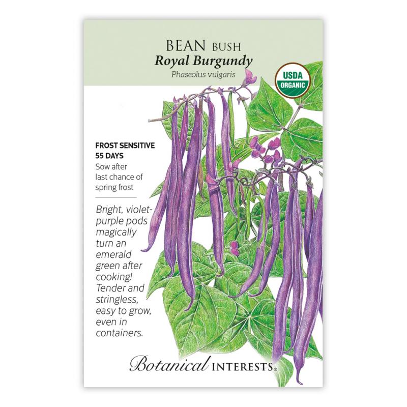 | Royal Burgundy', fresh from your garden, has delicious purple pods that are easily found among the backdrop of green foliage. It grows better than other varieties in cool weather and is unlikely to be challenged by bean beetle. A good container variety. Disease resistant. |
