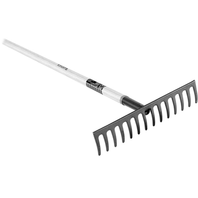 Homeowner grade level head rake with a 60" L lacquered ash wood handle. Clear-coated grey-steel finished head with 16 teeth and steel collar. Ten-year warranty.