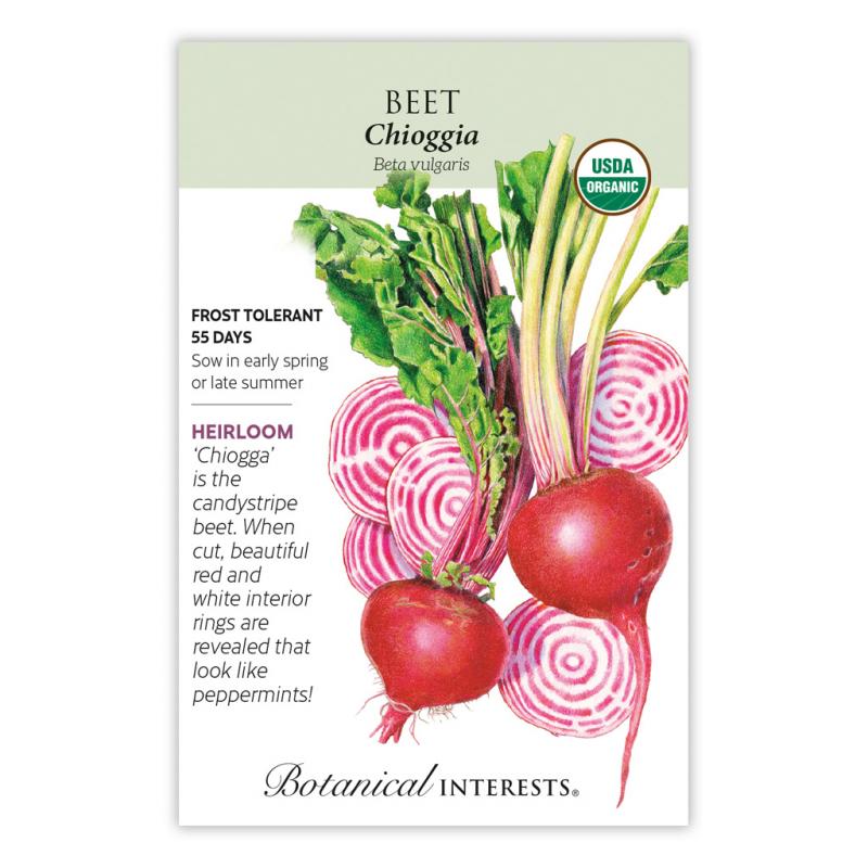 | This Italian heirloom from the mid-1800s got its name from a fishing village near Venice, Italy. 'Chiogga' has delicious green tops and tasty roots. Each seed produces multiple plants and the thinnings are a delightful addition to your salad. Packed with nutrition, beets are high in fiber, potassium, folic acid, and the antioxidant, betacyanin. Delicious roasted, steamed, and pickled. |