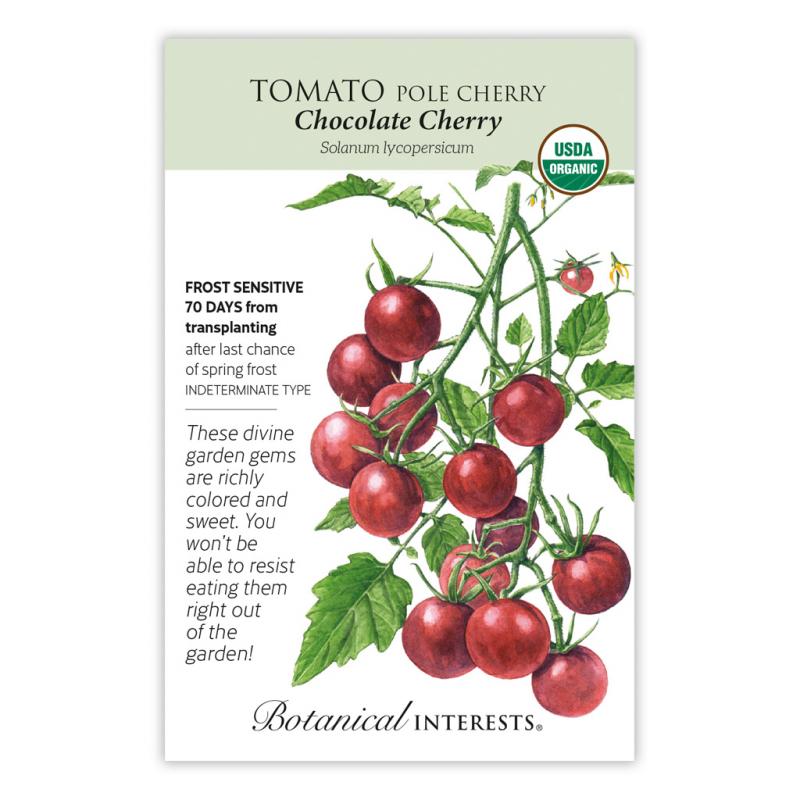 | Chocolate Cherry' tomatoes—doesn't just the name make you hungry? These 1" purplish-red, delectable tomatoes are great for snacking on and add a little sweetness to salads and pastas. The prolific vines bear seemingly endless trusses with 6–8 crack-resistant fruits that will keep you coming back for harvest after harvest. |