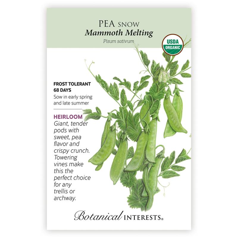 | 'Mammoth Melting' Snow Pea lives up to its name, producing exceptionally large, sweet, and tender pods perfect for fresh eating, stir-fries, or freezing. This heirloom variety boasts vigorous vines that can reach up to 5'–6' tall, making it a standout in the garden. Despite its impressive size, the pods remain delicate and melt-in-your-mouth tender. These peas thrive in cool weather and offers a prolonged harvest, with prolific yields. |