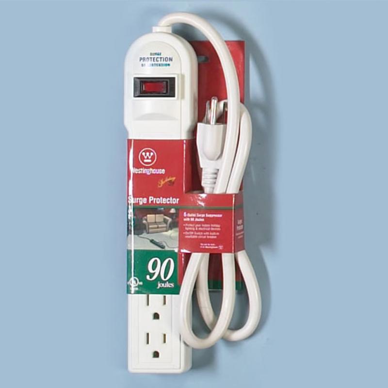 | This six-ground outlet with 90 Joules of surge protection has an on/off switch with a resettable 125V/15A circuit breaker. It also has a 1.5-ft 14/3 AWG power cord and a protection indicator light. |