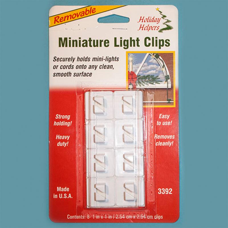 | Holiday Helpers have an eight-pack of white, adhesive plastic mini light clips. These 1-inch clips will hold approximately 1/4 pound when correctly applied to a smooth, clean surface. They are designed for mini lights or cords. They can be used indoors or outdoors |