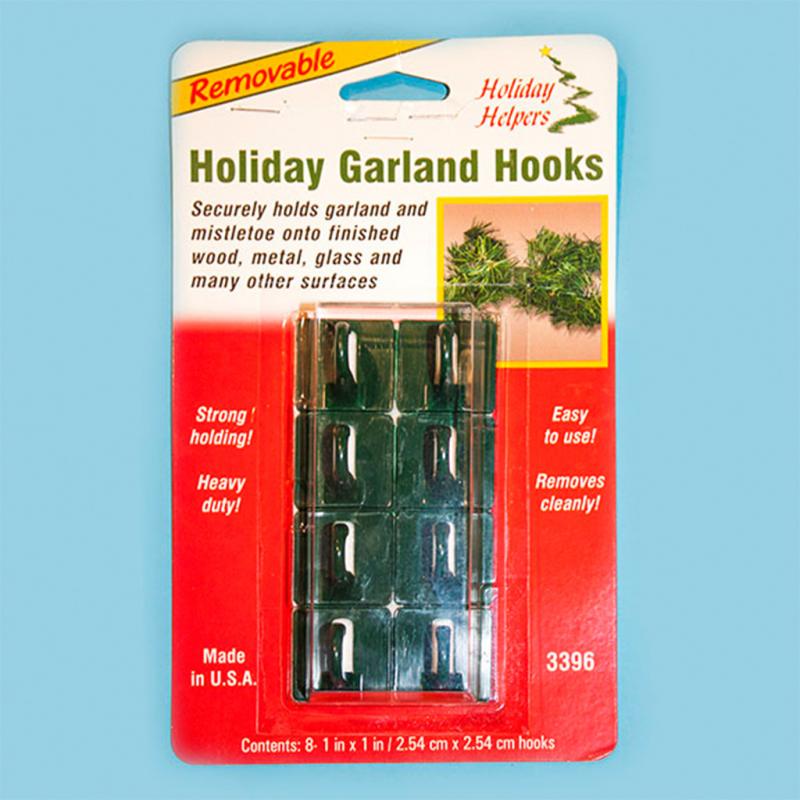 | The Holiday Garland Hooks are an 8-pack of adhesive plastic green garland hooks. They are 1 inch and will securely hold garland and mistletoe onto finished wood, metal, glass, and many other surfaces. They can be used indoors or outdoors. |