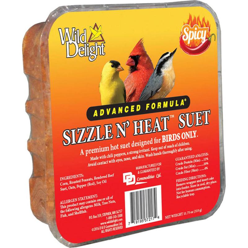 | A premium hot suet designed for BIRDS ONLY. Industry studies show that squirrels frustrate both wild birds and wild bird enthusiasts by eating suet intended for the birds. By offering Sizzle N' Heat Suet, you can deter the neighborhood squirrels from taking over your backyard feeder. | |