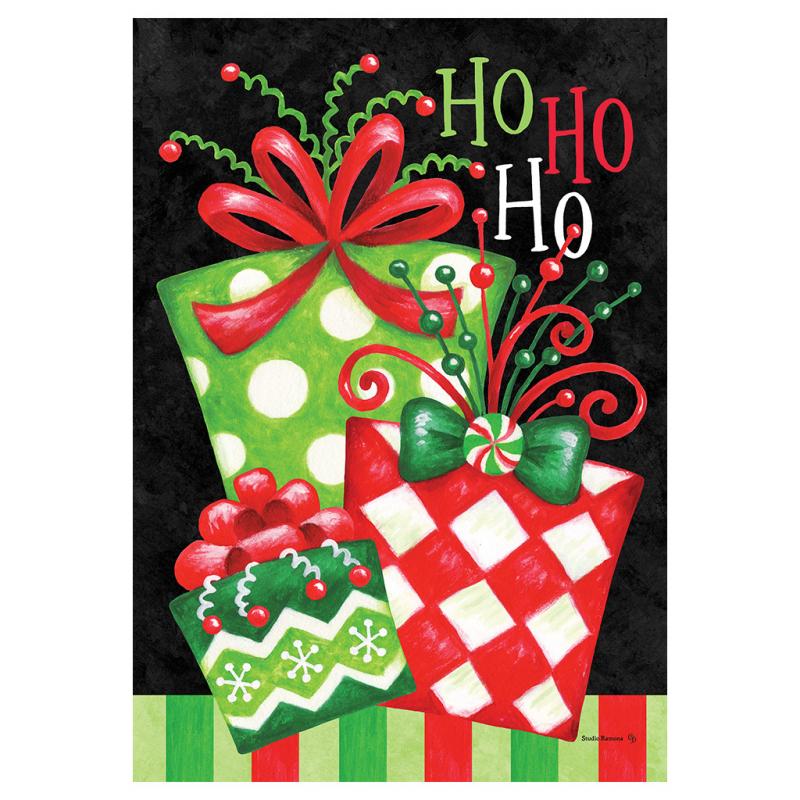 | This Gifts & Bows / Ho Ho Ho Large Home Flag from Custom Decor welcomes you in the season. It is one of their gorgeous double-sided flags, proudly printed here, in-house in the USA! Each flag is printed using fade-resistant ink on luxurious, velvety, soft, heavyweight fabric, creating a beautiful drape showcasing its stunning design. |
