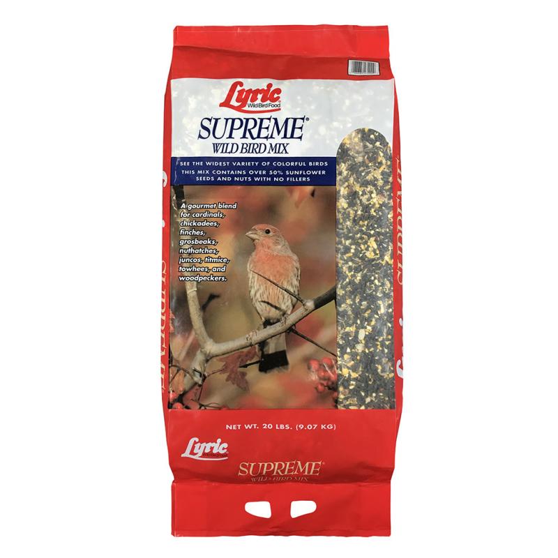 | Lyric Supreme Wild Bird Mix is full of all-natural, tested ingredients to attract a wide variety of colorful feeder birds. It contains black oil sunflower seed, white proso millet, cracked corn, shelled peanuts, safflower seed, black striped sunflower seed, pecans, pistachios, small golden millet seed, canary seed, Nyjer seed and sunflower kernels. |