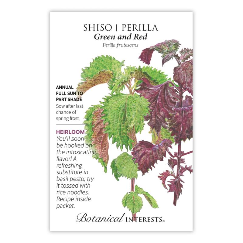 | An absolute must for herb gardens! Also called Japanese basil or beefsteak plant, shiso's incredible flavor can be described as a combination of cinnamon, mint, and clove with overtones of cumin. A beautiful, heat- and drought-tolerant bedding plant that attracts pollinators, and is excellent for containers. This packet provides 75% green shiso and 25% red. |