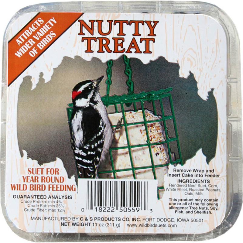 | Nutty Treat Suet contains rendered beef suet, corn, white millet, roasted peanuts and oats. Treats will become soft and pliable at 100 degrees if exposed to extreme heat. They will return to normal hardness at room temperature. For year round wild bird feeding. |