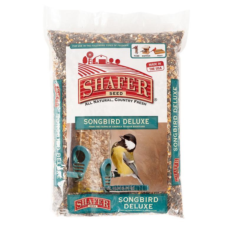 | Shafer Seed's Songbird Deluxe blend with 20% Sunflower and premium seeds offers the backyard bird enthusiast a moderately-priced food that is the real deal! Songbird Deluxe can be used in all types of feeders as well as being a great mix to attract those wonderful ground feeding birds. You’ll get all the regular customers like Cardinals, Chickadees and Finches as well as other indigenous backyard visitors. | |