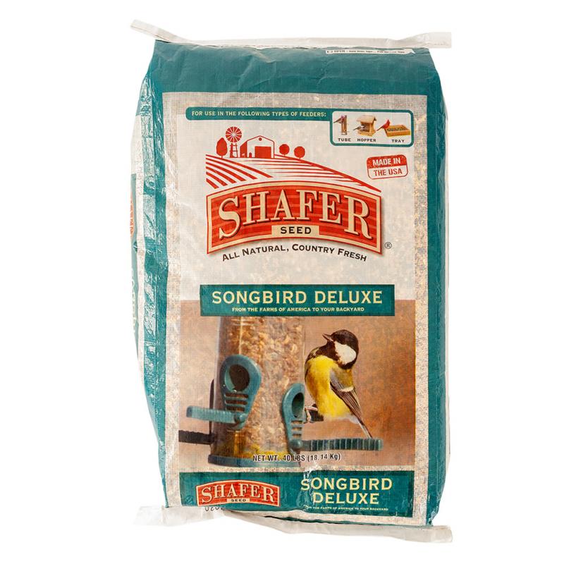 | Shafer Seed's Songbird Deluxe blend with 20% Sunflower and premium seeds offers the backyard bird enthusiast a moderately-priced food that is the real deal! Songbird Deluxe can be used in all types of feeders as well as being a great mix to attract those wonderful ground feeding birds. You’ll get all the regular customers like Cardinals, Chickadees and Finches as well as other indigenous backyard visitors. | |