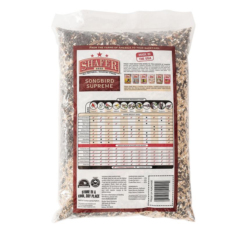 Description: Songbird Supreme is our favorite blend because it contains more of what your Songbirds want and has NO filler ingredients. This Premium Blend includes high concentrations of tasty quality seeds preferred by the Songbirds you want to see in your backyard. With greater than 40% of the blend being highly-desired Black Oil Sunflower and Sunflower Kernels, your favorite birds will flock to the feeder. The Peanut Kernels, Safflower seeds, Raisins, Cranberries and White Millet will assure that you can nurture and enjoy a wide variety of beautiful Songbirds throughout the year. By adding only the best ingredients we have created a highly attractive and nutritious blend for backyard feeding.