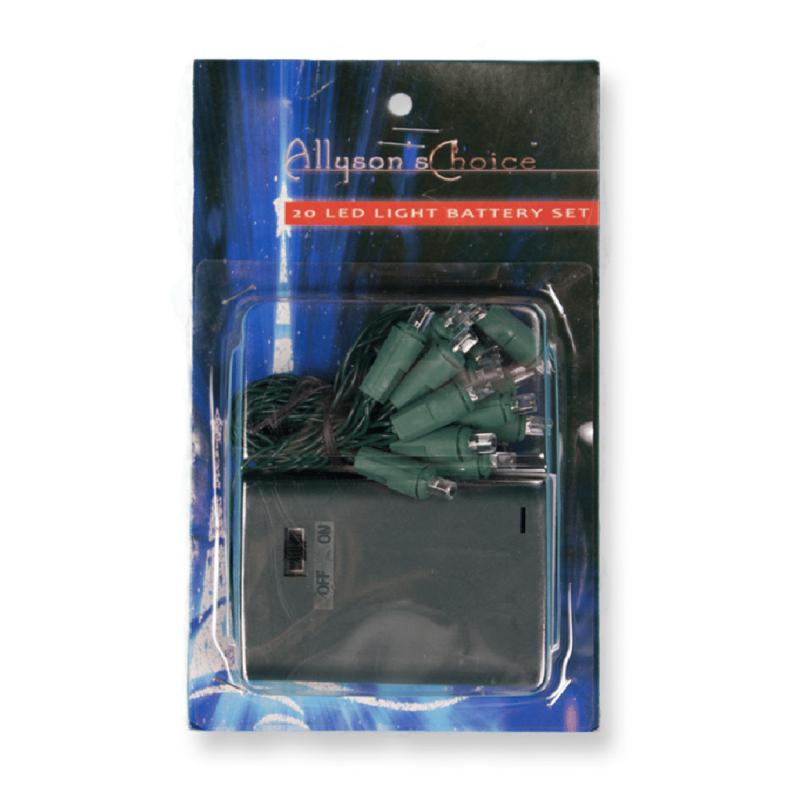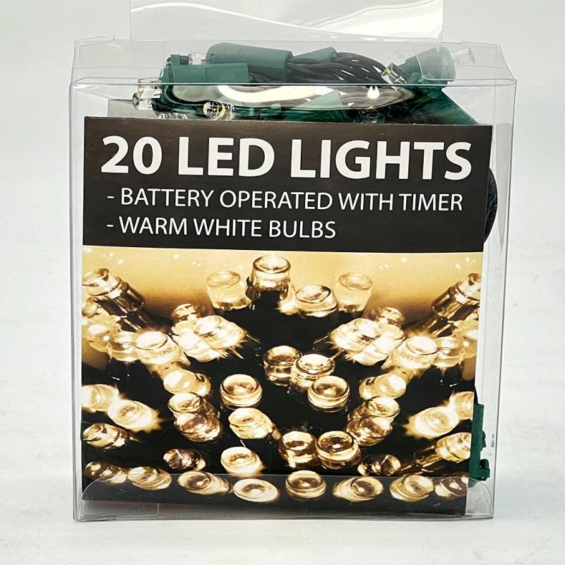 Description: This Battery-Operated 20 warm white LED 5MM conical light set has a green wire and a 10-inch lead. The total light length is 6.5 feet, and the bulbs are spaced 4 inches apart. This set requires 3 AA batteries with an automatic timer (6 hours on, 18 hours off).