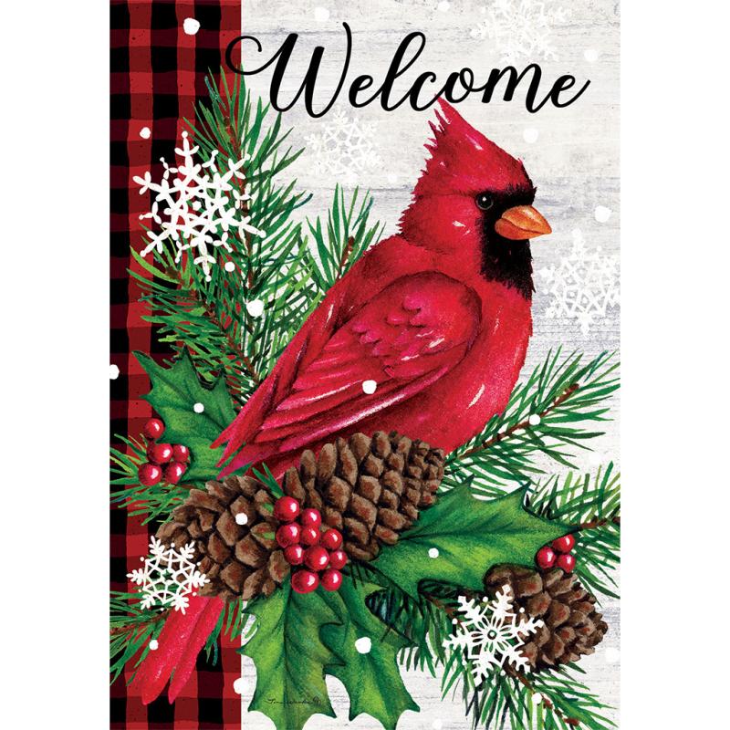 | This Welcome Cardinal Large Home Flag from Custom Decor welcomes you in the season. It is one of their gorgeous double-sided flags, proudly printed here, in-house, in the USA! Each flag is printed using fade-resistant ink on luxurious, velvety, soft, heavyweight fabric, creating a beautiful drape showcasing its stunning design. |