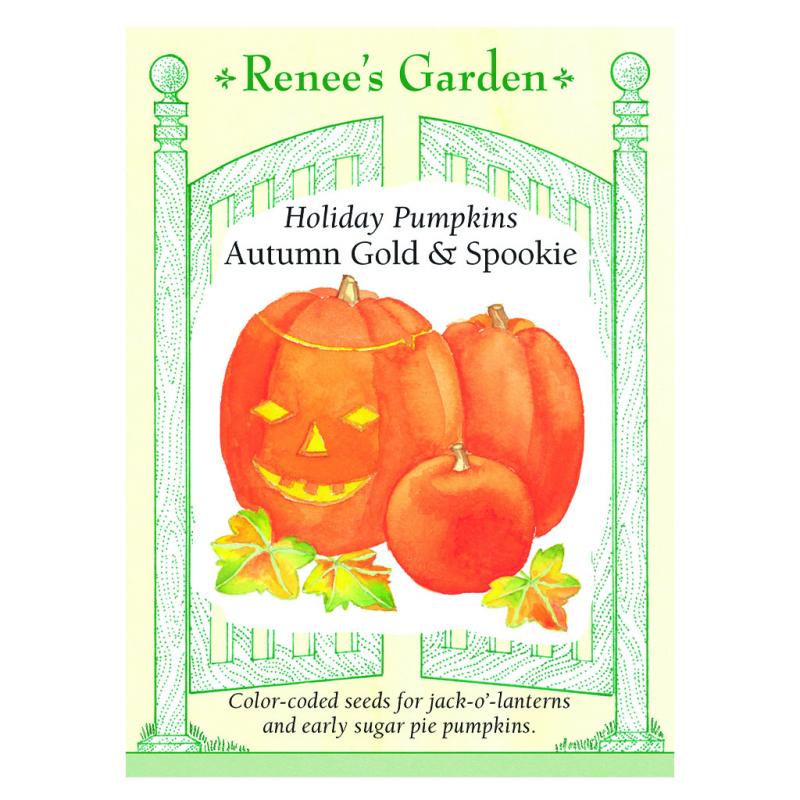 | Grow two pumpkins of different sizes with our color-coded seeds—larger 15 to 22 lb. Autumn Gold pumpkins color up early into beautiful, smooth-skinned Jack O'Lanterns, ideal for carving holiday faces. Smaller Spookie sugar pumpkins also mature early, producing an abundance of 5 to 6-pound beauties to carve or bake into tempting pies. Kids love them, and they make wonderful decorations and scene-stealing centerpieces. | |