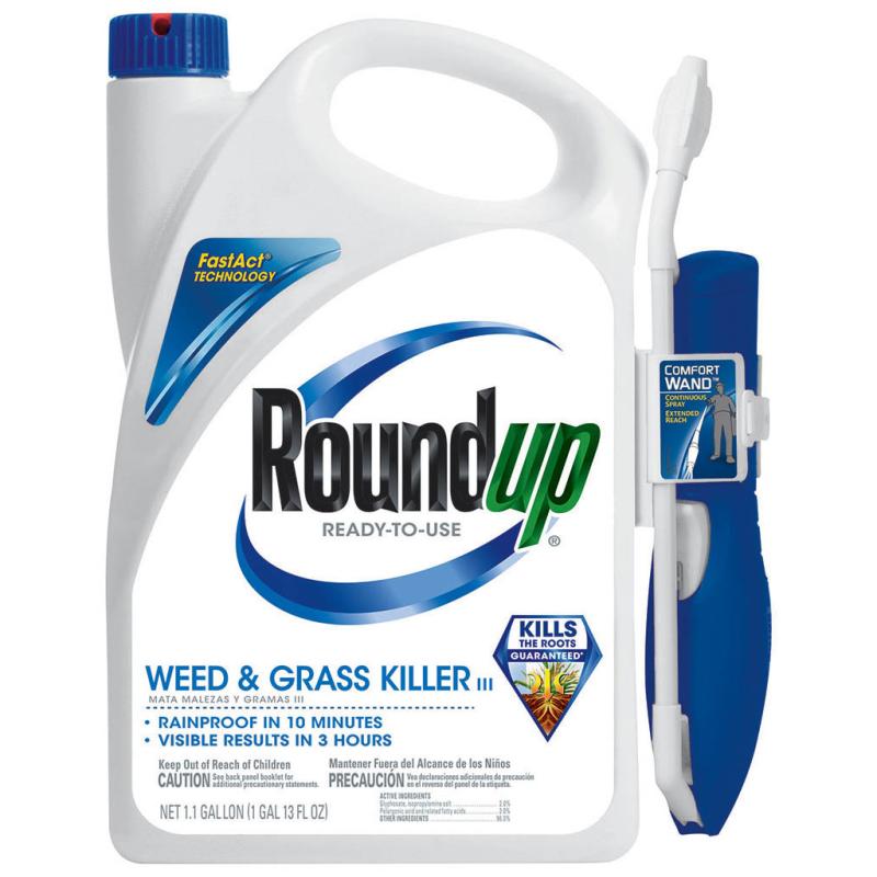 | Roundup Weed And Grass Killer kills the toughest weeds and grasses to the root, guaranteed. Convenient, no-mix formula can be used in and around vegetable gardens, flower beds, tree rings and mulched beds, as well as in driveways, walkways and patios. Rain proof in ten minutes. Visible results in 3 hours. Active ingredients: 2% Glyphosate; 2% Pelargonic acid, and related fatty acids. |