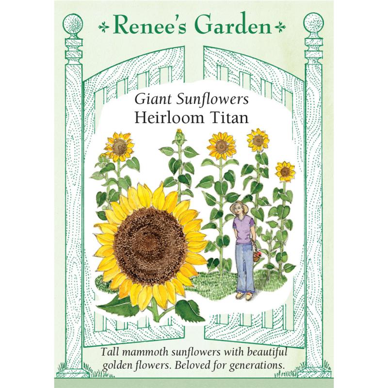 | (Helianthus annuus) This choice strain of traditional mammoth sunflower has been reselected and saved by generations of seed savers for handsome, strong plants that reach up 12 to 14 feet tall to follow the sun. Each stalk is topped with a beautiful golden flower face with a dark center disk. When petals drop and the seeds mature, harvest the heads of plump kernels for a bountiful crop of sunflower seeds for fiber-rich, tasty snacks or as a welcome feast for songbirds. |