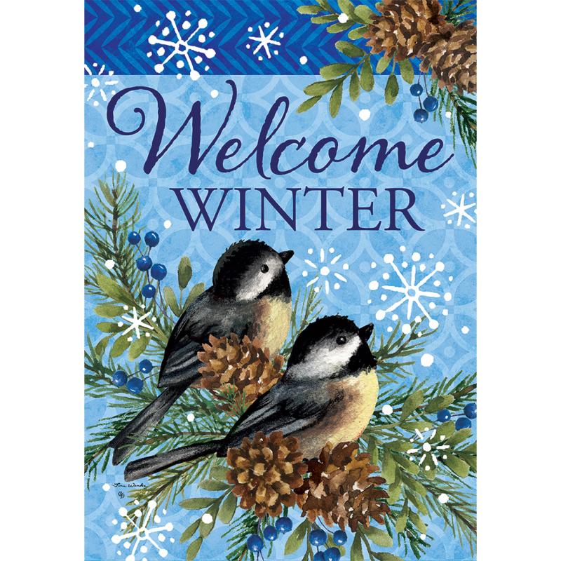 | This Winter Chickadees Large Home Flag from Custom Decor welcomes you in the season. It is one of their gorgeous double-sided flags, proudly printed here, in-house in the USA! Each flag is printed using fade-resistant ink on luxurious, velvety, soft, heavyweight fabric, creating a beautiful drape showcasing its stunning design. |