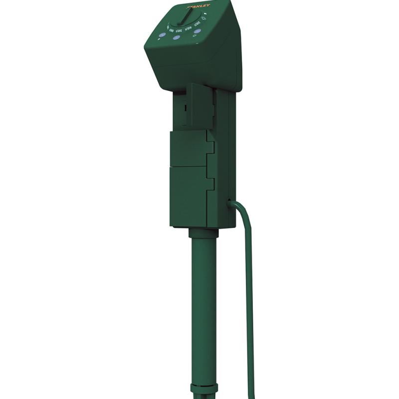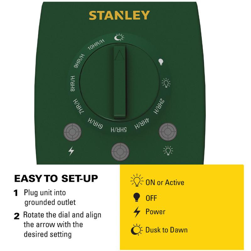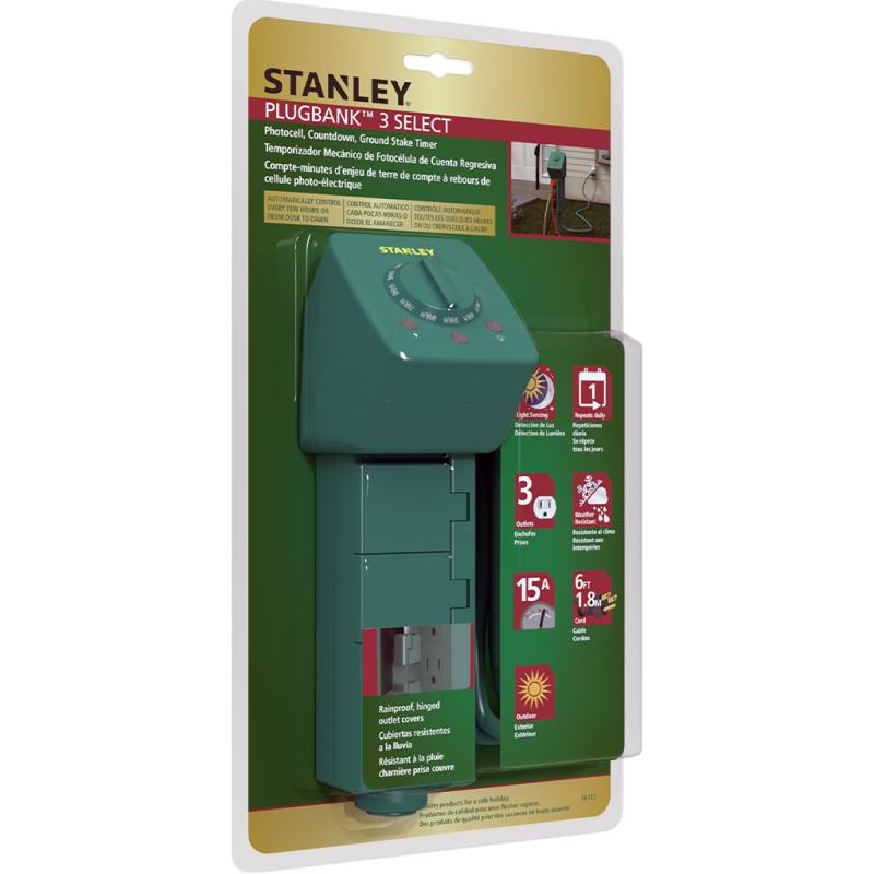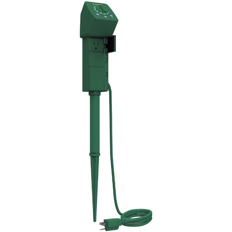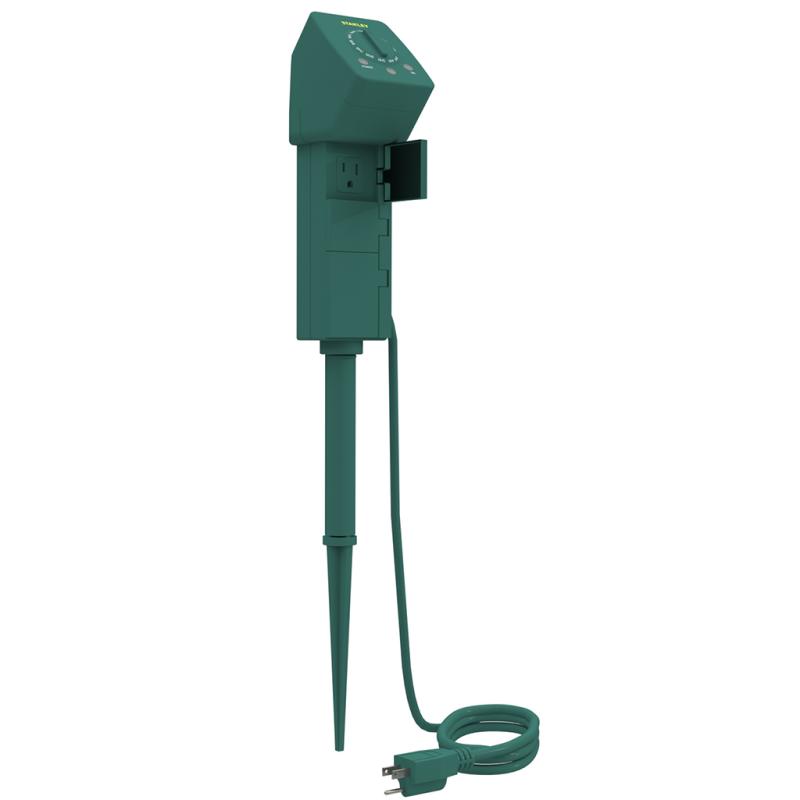 | This Stanley darkness-sensing 3-outlet green ground Stake has three grounded outlets, hinged outlet covers, a wall mountable, and a 12" rotating ground stake. It has overload protection with the built-in reset button. The program repeats daily with a constant ON/OFF option. It can be set from dusk for 2 to 10 hours. The overall height is 12 inches. |