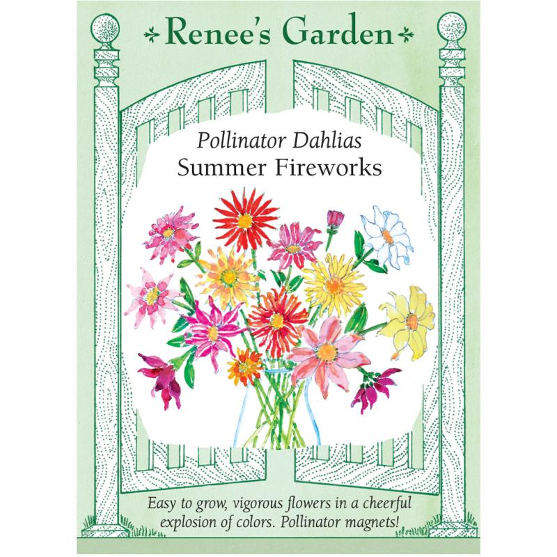 | (Dahlia variabilis) Easy to grow from seed, these vigorous dahlias bloom hard all season in an explosion of colorful blossoms. The branching plants reach 3 ½ to 5 feet with a season-long profusion of cheerful 4 to 5-inch, slightly curved, spidery blossoms that shine in excellent colors: cherry, lemon chiffon, peach, red, alabaster, coral, and rich burgundy. Summer Fireworks blossoms attract and feed a fantastic array of pollinators, including honeybees, butterflies, and hummingbirds. Make big bouquets all summer! |